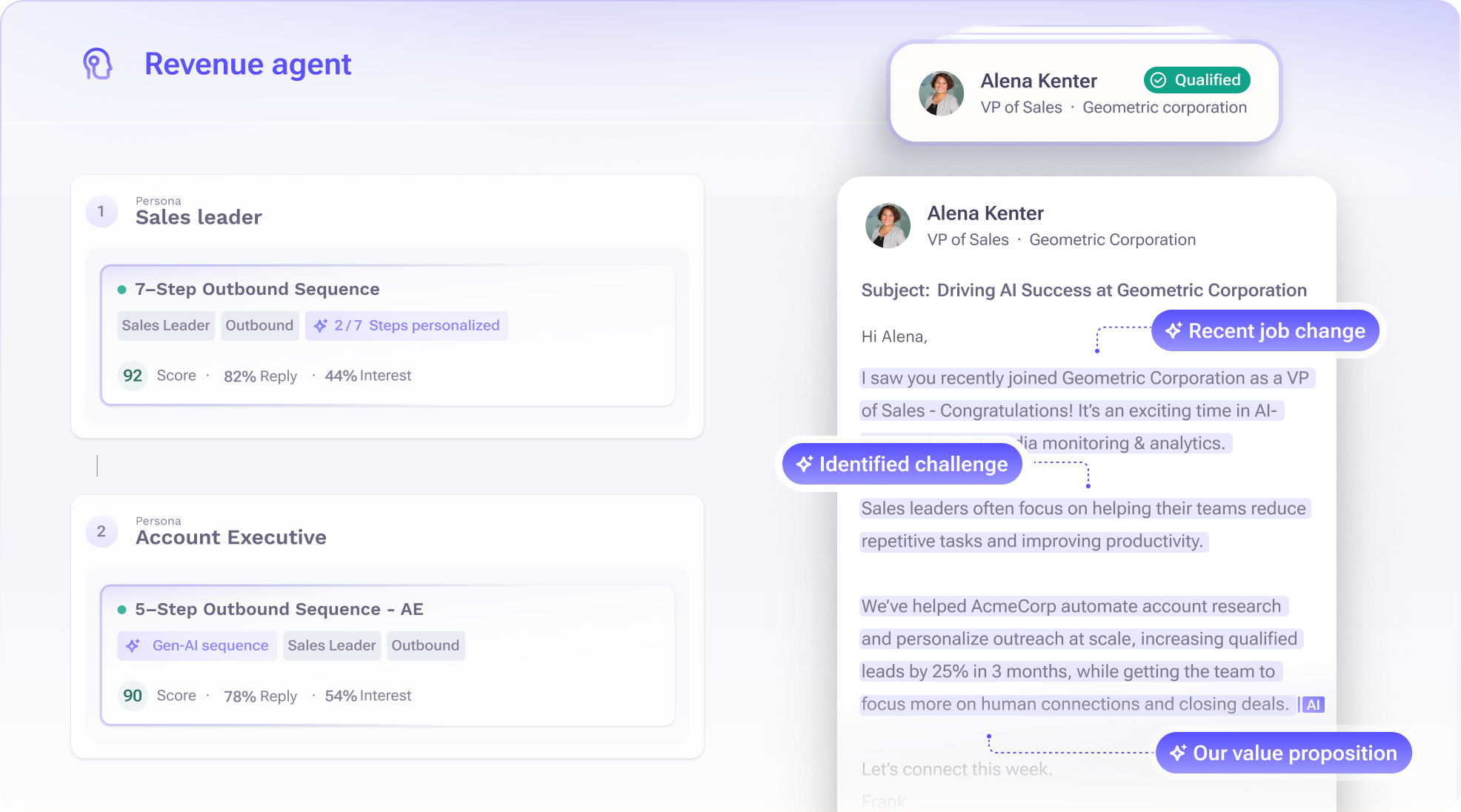 All right. Well, we just heard a great story about leveraging Kaia and conversational intelligence to uplevel coaching and go to market performance. I am here to talk to you all about what is quickly becoming the hottest topic around AI and that is agents. If somehow you've made it this far in the conference and you have not heard about our revenue agents yet, don't worry. You will get a deep dive into the product and our broader vision in future sessions. But here's the high level. Our agents are designed to help your go to market teams scale some of their more time consuming but critical workflows. They can identify the right prospects and accounts to target, enrich those records with meaningful insights, and then generate personalized high quality content on behalf of your teams. So in short, it's like having a teammate that is always working behind the scenes to keep your pipeline full and your Outreach relevant. Today, I wanted to give you a quick behind the look behind the scenes look into how we at Outreach are using AI revenue agents. We actually initially called them prospecting agents, and that's just because that's where we started. As soon as we got this functionality into the hands of our teams, we quickly realized, Okay, actually it can do way, way more than that. So we changed the name. We use agents for lead follow-up, for retention and expansion workflows, for event promotion like Unleash, for renewal management. Right? The list just continued to grow. And the reason for that is really simple. Our revenue agents are incredibly flexible. They can adapt to the workflows that you already have in place. So some of those might call for an agent that is doing the targeting, the enrichment, the personalization. Others, you might already have the workflow in place and you just need to amplify it with AI personalized content to help it scale, right? So it's really not one size fits all. It is truly about what best fits the job to be done. However, with all that said, I am still going to focus today on our outbound prospecting use case because it really is one of the clearest and most powerful ways to demonstrate the full value that our agents can deliver. So our first prospecting use case that we built out internally, we partnered with one of our VPs of sales who wanted to build an agent specifically focused on pitching our forecasting product to new and existing customers. So let's walk through how exactly we set that up. We knew that we wanted to target accounts within our book of business that used a competing forecasting tool already. So we added that as a filter to help the agent hone in on those accounts in particular. We also wanted to focus on two particular segments, enterprise and corporate. From there, to ensure that our pitch was coming at the right moment, we asked the agent to watch out for key signals that indicate to us, Okay, this is a good time to get in front of them and talk to them about forecasting. So the agent watches these accounts and essentially waits until we pick up on a meaningful signal, like a workforce change in the sales department, new product launch, new funding round, new investment. Next, we aligned on who exactly we wanted to target and agreed to pursue director and above titles across sales, operations, marketing, and finance. Next, we decided, all right, what sequence do we want the agent to use to engage these prospects? And we worked to integrate AI prompting into the email steps so that the agent could successfully mix our forecasting value props with relevant account and prospect data and those third party insights to create that personalized messaging. Finally, we wrapped up by deciding who the communication should come from. So for existing contacts, that was the contact owner. For new contacts sourced by the agent, that was the account AE. So you saw the GIF. That was about, I don't know, a minute, minute and a half. Very quick and simple to set up once we knew what we wanted to achieve. The next question is then, Okay, what does this look like for my end users when an agent picks up one of their accounts, right? The biggest value here is that their workflow does not change at all. They are still starting their day on the familiar three sixty degree home page. They start working through their tasks. The primary difference is that when they launch an email where the agent has done the heavy lifting, they simply need to review the output, make any tweaks if they want to make adjustments, and hit Send. It's truly as easy as that. So I know that the text on that screen is a little hard to read. So here's a closer look at the kind of email that our revenue generates automatically for our team. Again, we provided the agent with specific predefined prompting that gives it the context around why it's reaching out, who it's reaching out to, the relevant information, the third party signals, and our own go to market messaging. And this is what it gives us. This email hits all the marks, right? It opens with that timely signal that it picked up on, so the product launch. It then makes a reference to this individual's title, specifically their role at the organization, the things that they probably care about, and why forecasting, especially now, is going to be very important to them. Next, now it's weaving in our go to market messaging and our forecasting pitch, makes another callback to that product launch, and finally ends with a nice, clean, clickable link to book time with the rep. This entire message was generated in a matter of seconds. Right? It's personalized. It's relevant. It's ready for our team to send. Yeah. That's how I feel. All right. And just because these are really fun and I have a little more time, I'll show you one more example from a different use case, very different use case. In this scenario, we've actually prompted the agent to help us respond to a customer who's filled out our NPS survey and given us specific feedbac