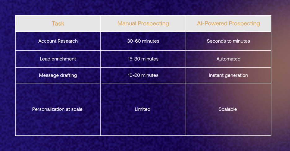 AI reduces prospecting time by automating manual tasks such as account research, contact enrichment, and message drafting, allowing reps to focus on engaging prospects and closing deals.